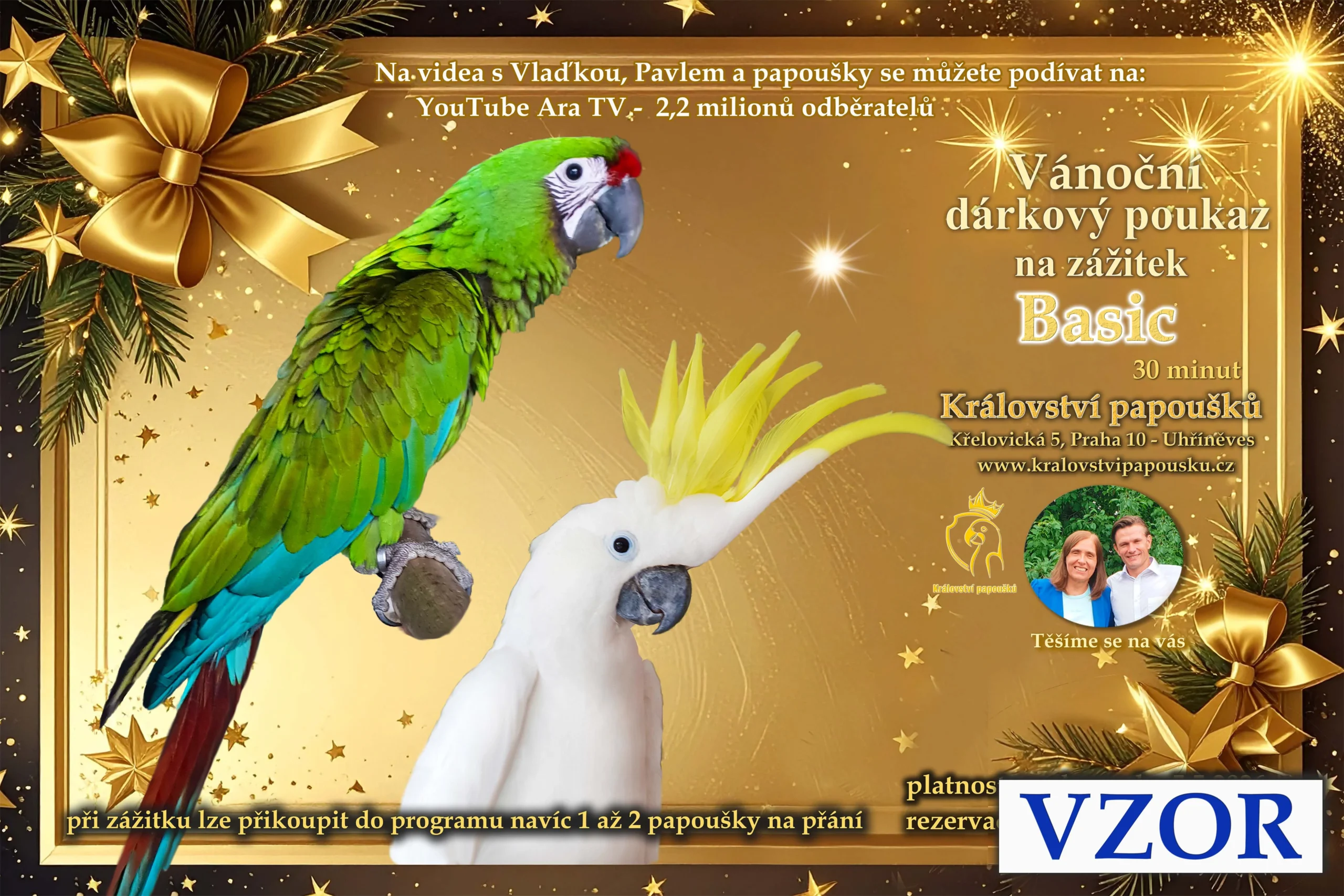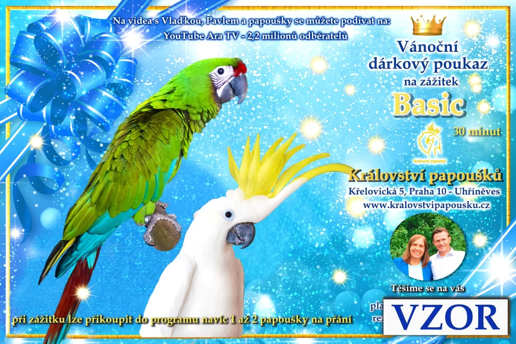 V zážitku Basic máte kontaktní program s mazlivým kakadu žlutočečelatým Angelem a arou vojenským Maruškou. Papoušky si můžete vzít na ruku, pohladit si je, fotit se s nimi. Kakadu Angelo je velmi mazlivý a nechá se hladit po zádech a pod křídlem. Vrozenou přirozeností kakadu je předvádět se, např. tancují, roztahují křídla, aby upoutali vaši pozornost na sebe nebo zvedají svou krásnou chocholku. Ara Maruška je moc milá a nechá se krásně hladit.