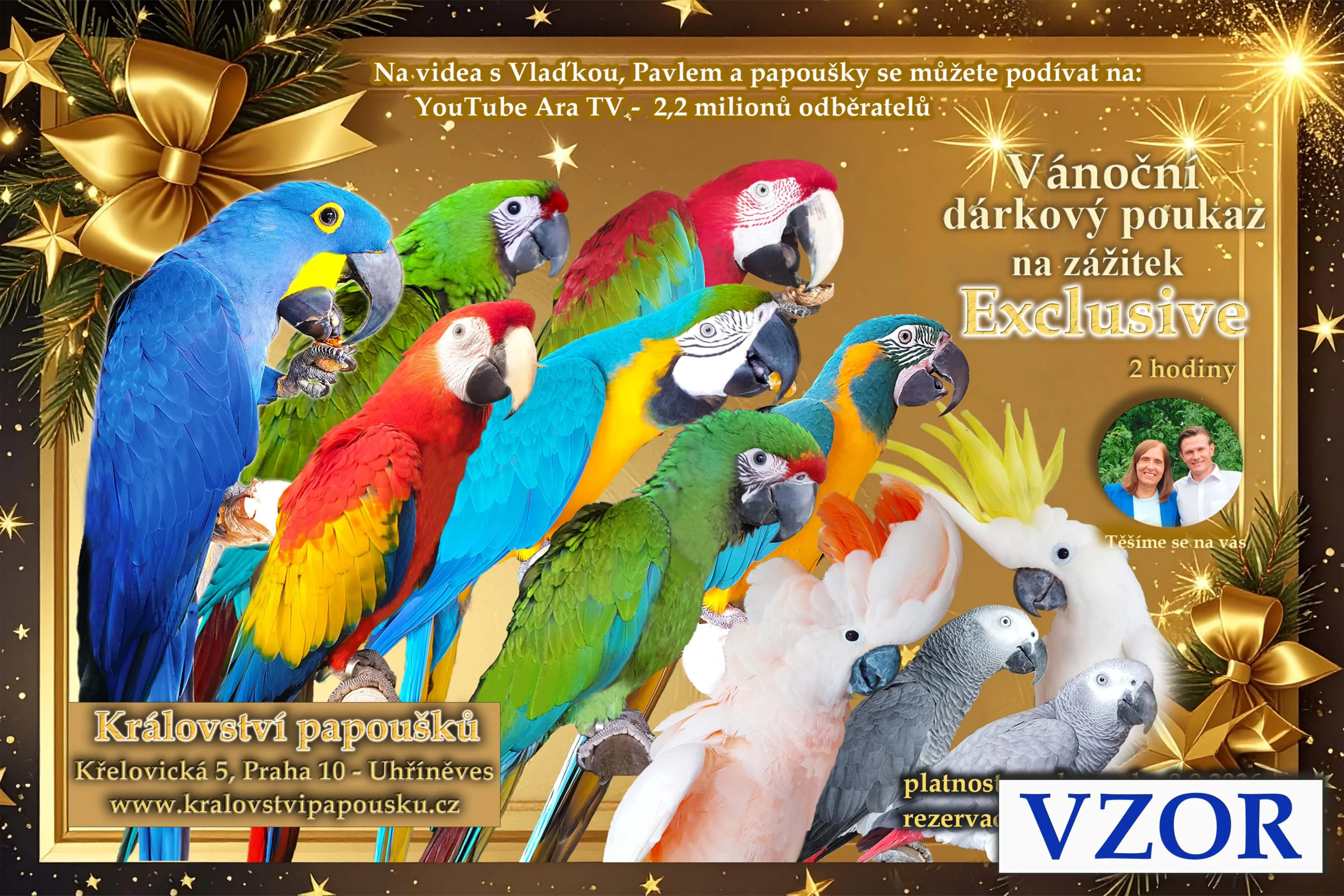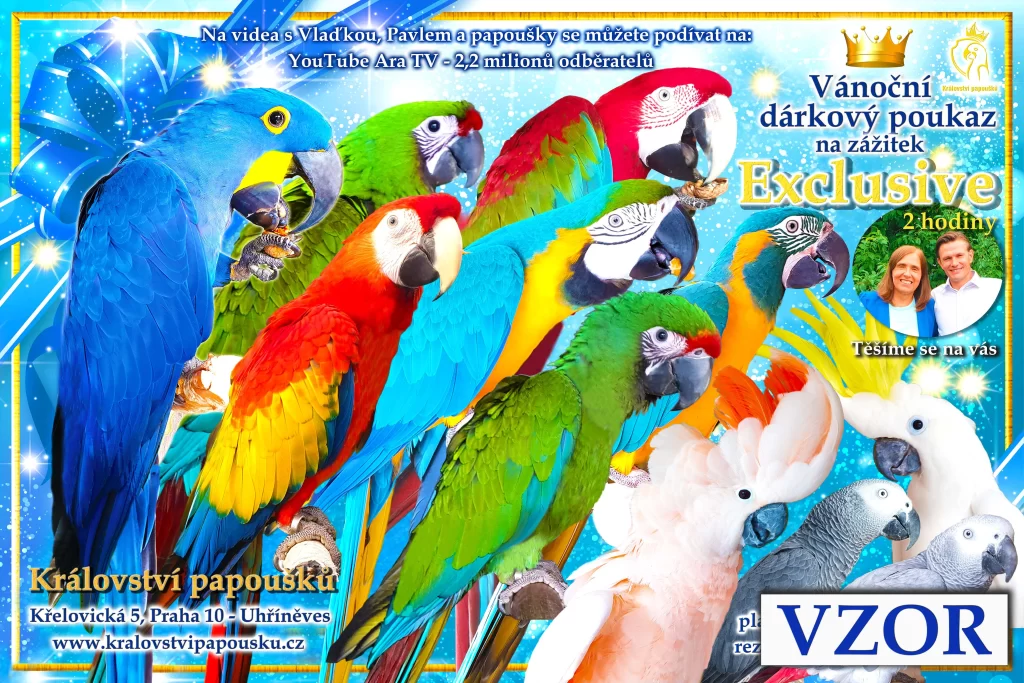 V zážitku Exclusive máte možnost zblízka poznat 11 papoušků. Seznámíte se s největším papouškem světa arou hyacintovým Oskarem, vzácným arou kanindou Riem, zkušenými arou araraunou Erikem a arou zelenokřídlým Arnym, krásným arou arakangou Markem, nepříbuzným párem arů vojenských Maruškou a Rockym, vzácnou a mazlivou kakadu moluckou Lady, mazlivým kakadu žlutočečelatým Angelem a dvěma ochočenými žaky Adélkou a Charliem.