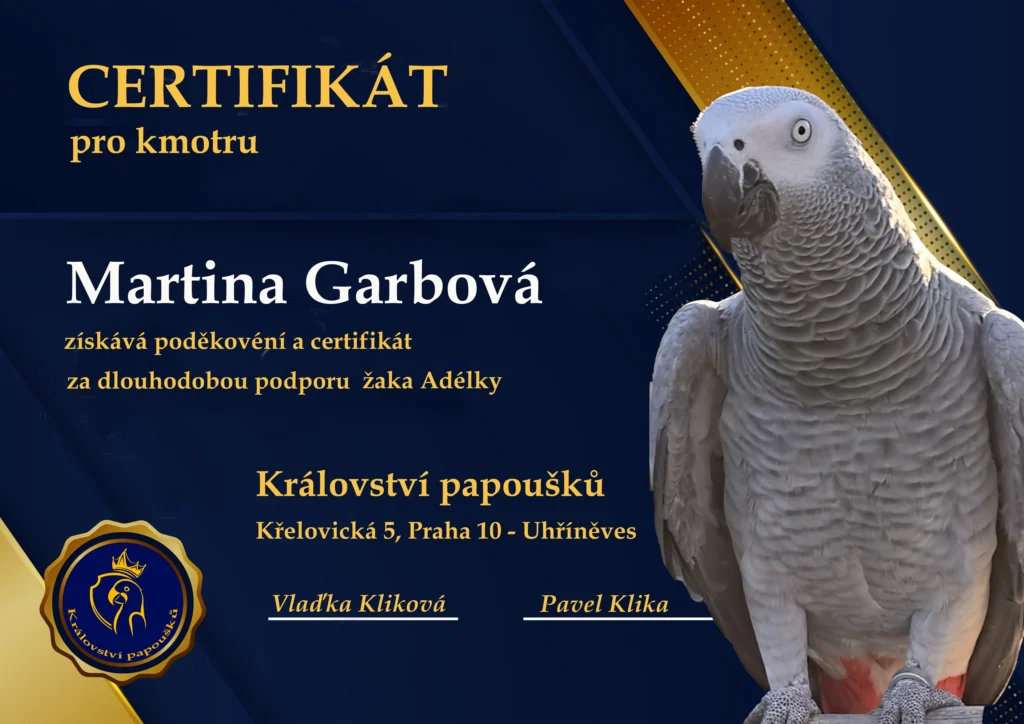 K ročnímu výročí kmotrovství (po obdržení 12-ti příspěvků) vám zašleme mailem certifikát s fotkou papouška, který si můžete vystavit.